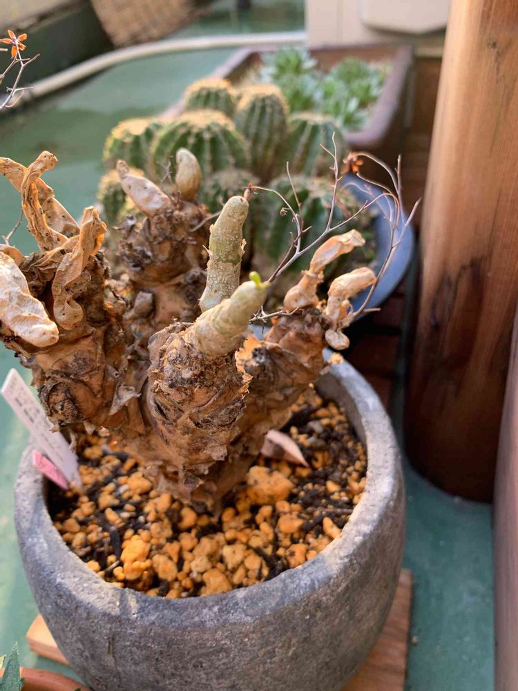 やっとピッと新芽生えてきた。夏に初めて冬型多肉 の 万物想 買ってすぐクシャクシャになって休眠はいったから、心配してたけどやっときた。ピッだけ🤣