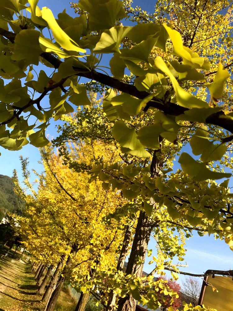 どこかの銀杏並木よりスケールは小さいけど、この時期、諏訪湖畔を車で通るたびに綺麗だなぁって思ってました。