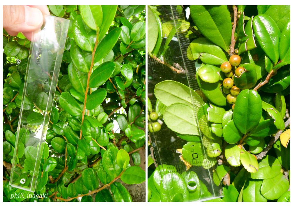 去る10/17にこの木をイヌツゲと思って投稿しましたが、ハマヒサカキでは、ないかと指摘を頂きました。自分もなんだかイヌツゲにしては葉っぱがおおきいなあ、と思っています。そこで、15cmのモノサシを画面に入れて撮ってきました。コレで見ると葉っぱは長さ3cmくらい、実は5-6mmくらいです。皆様からのご意見をお待ちしております。