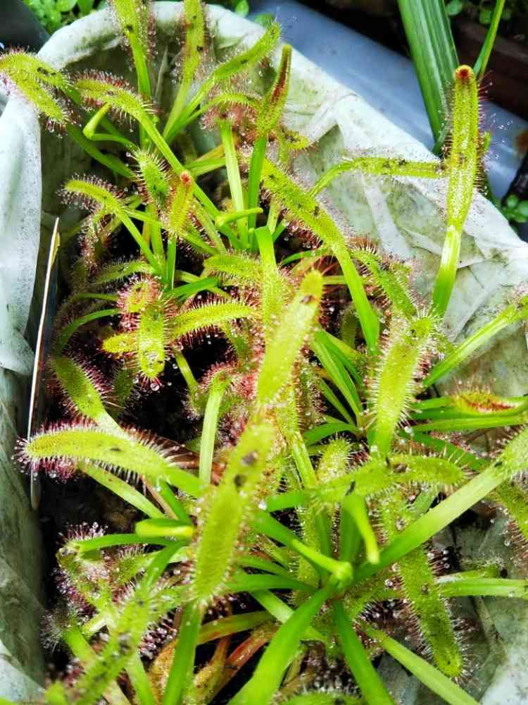 葉っぱから出る粘液で虫を捕らえて消化します。コバエがびっしり付いてるとグロいですが(*´・ω・`)