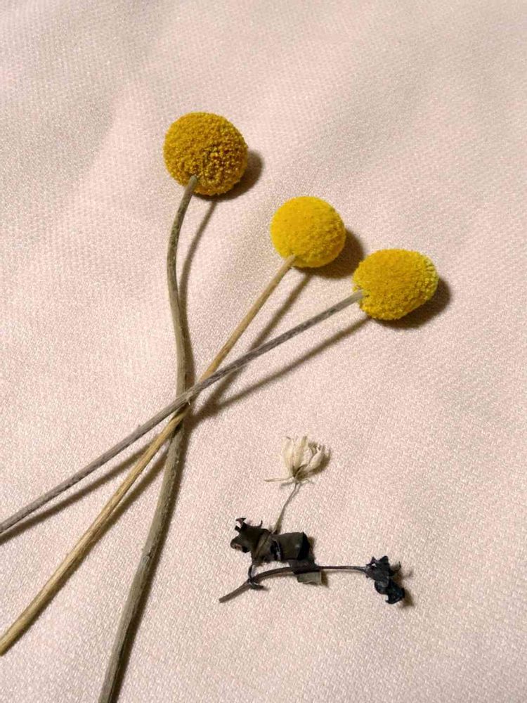 ドライフラワーのクラスペディア。ころんとした黄色い姿が可愛くてつい笑顔になってしまいます。