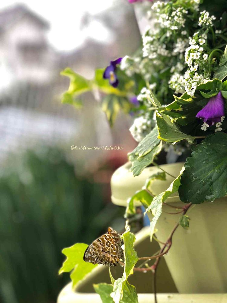これはハンギングバスケットの試作で雨に打たしていたもの。びしょ濡れなんでジーっとしている蝶々🦋でしたが、チョッカイしたら羽根をゆっくりハタハタしてアサギマダラぽい姿!?違いますよねー☆女神さまかと思いましたがこのコもかわいい💕💕💕