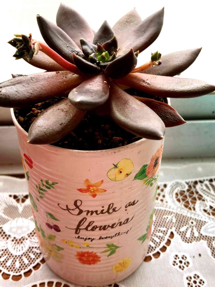 ベンケイソウ科エケベリア属の黒助(くろすけ)別名ブラックプリンス。春秋タイプで、肉厚の葉っぱは、紅葉するとグリーン色がだんだん真っ黒になります。ホールトマト缶をリメ缶にして、植えてみました。100均の水性ペンキと転写シールで描いて水性ニスで仕上げましたよ。