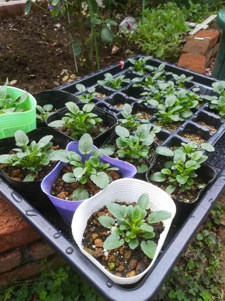 種を蒔いて2ヶ月少したったビオラ。ポットに移した苗は成長が早いです。