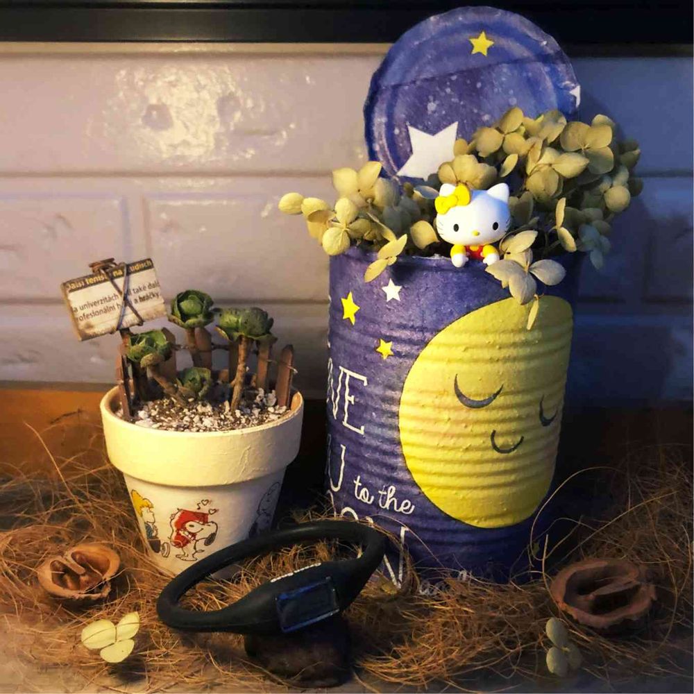 素敵なまゆみちゃんの🌙リメ缶に合わせて夜が来るのをウキウキで待ちながらお外で写真撮ってみました🤗
