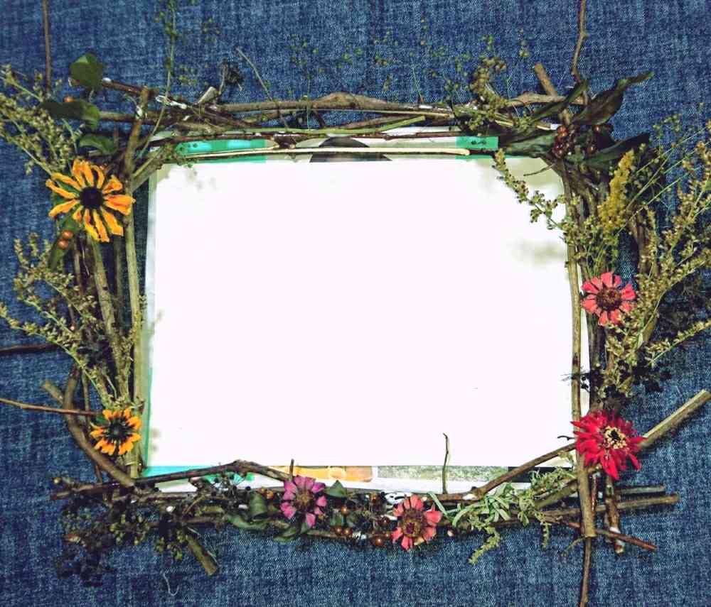 コツコツ干した花と集めた小枝でフォトフレームを制作中です。部屋の中ゴミだらけ❗