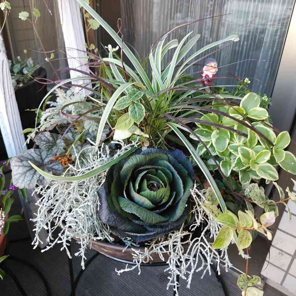 この寄せ植え、デザインと色あいが独特でとても素敵です!