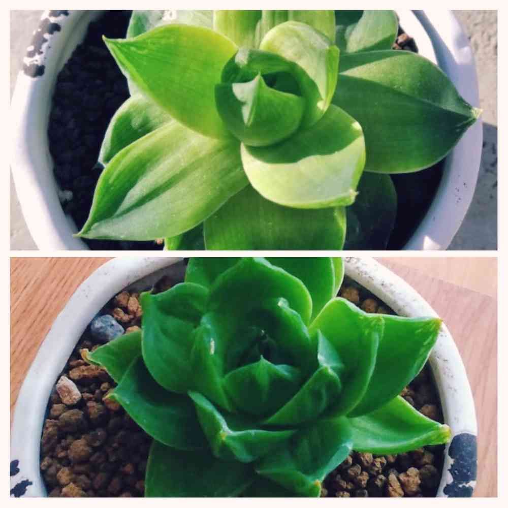 7月に園芸店からお迎えした🌵グリーンローズ🌵ハオルチア22号です。上が今朝、下がお迎えした時の写真✨ハオルチアの特徴の一つである窓は全くありません。本当にハオルチアなんだろうか?