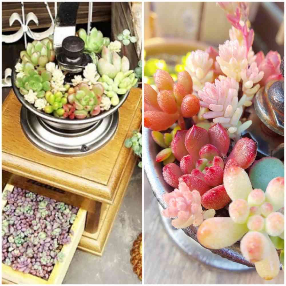 コーヒーミルに植えたミニ多肉達、植えた時のままでスカスカだけど色付いてきました💖