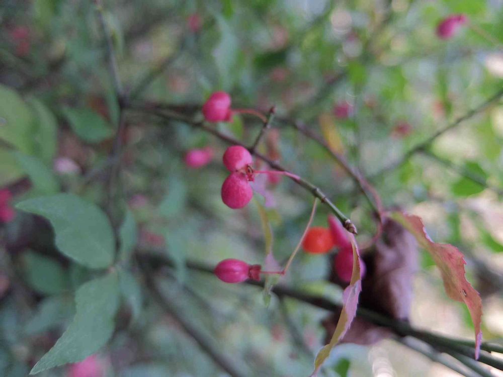 白山自然保護センターの川向かいに有る広場にて。赤い実があちこちに。図鑑見るとコマユミに似ていますが自信はありません。