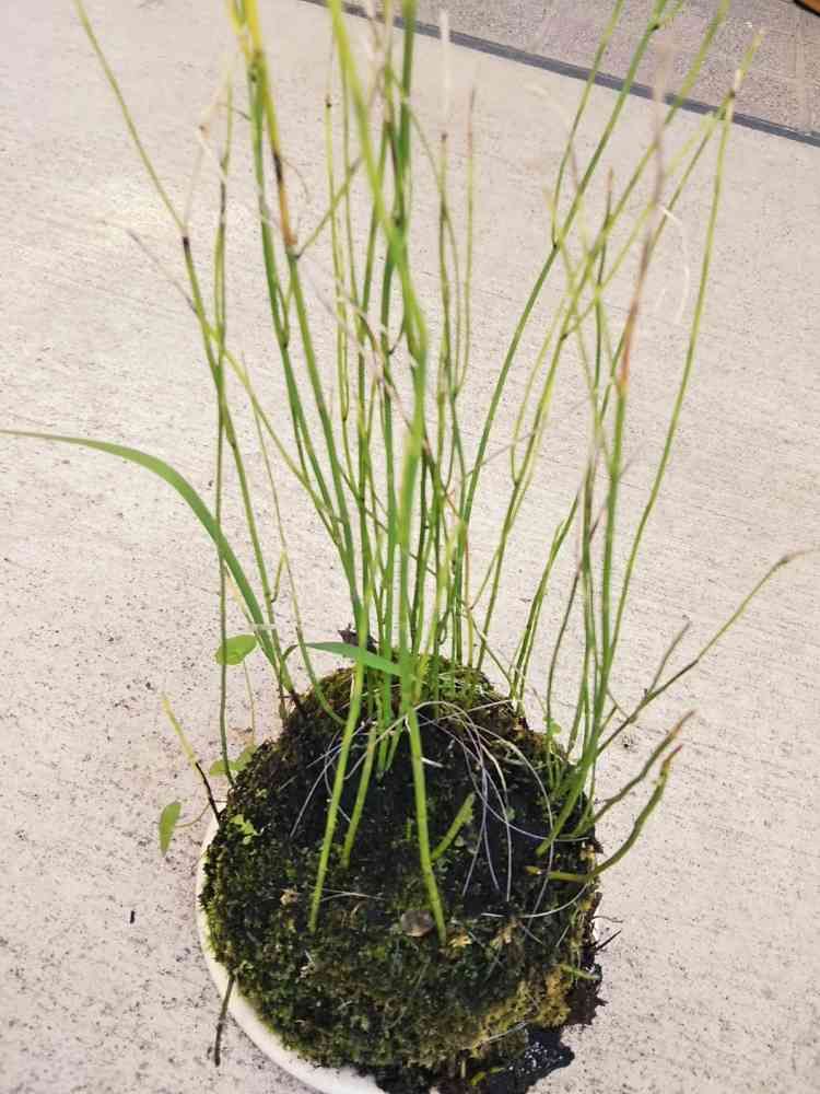 数年前に初めて作ったトクサの苔玉。横から根っこが飛び出してきてるのでこれも仕立て直さないと😅