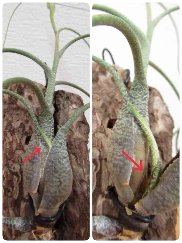 左の写真の様に、親株の間から、にょろっと出ていたので、親株の葉をむいてみたら、右の写真の様になってました🌱
