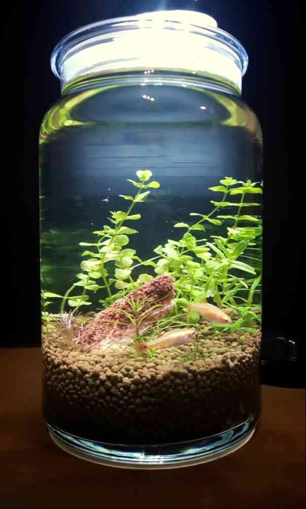 こんなに小さな入れ物でも植物と魚と両方が生きていけるんですね✨