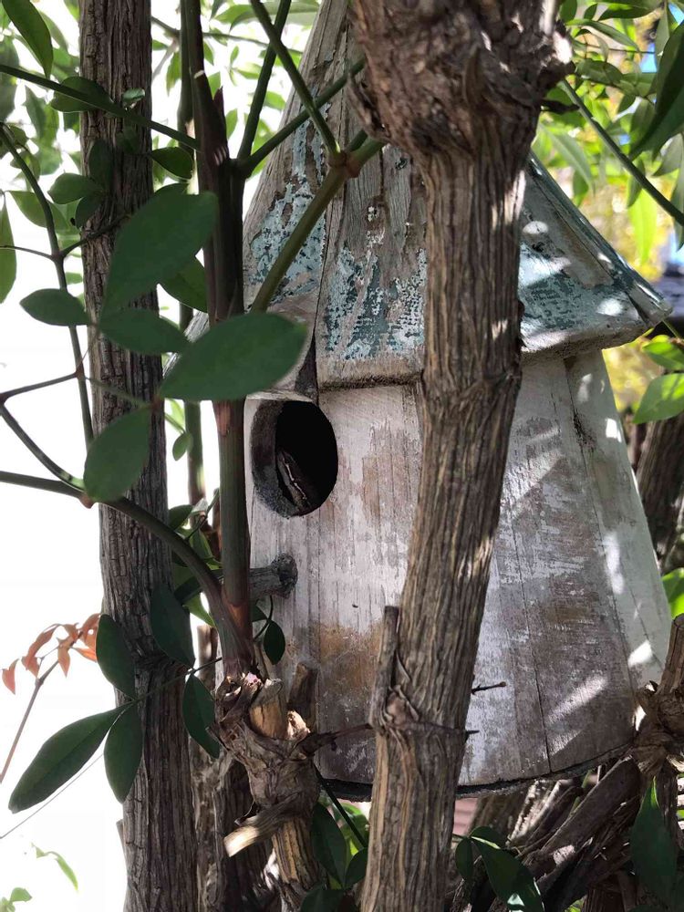 玄関脇の南天のツリーハウスにお住まいです。我が家の守り神になるでしょうか?