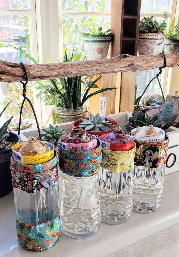 ヒヤシンスの水栽培用の容器が、けっこういいお値段なんです。😅 安いのもあるのかもしれないけど、買うより使えるものは使っちゃえ、という感じで、ペットボトルを利用しました。😄🎶