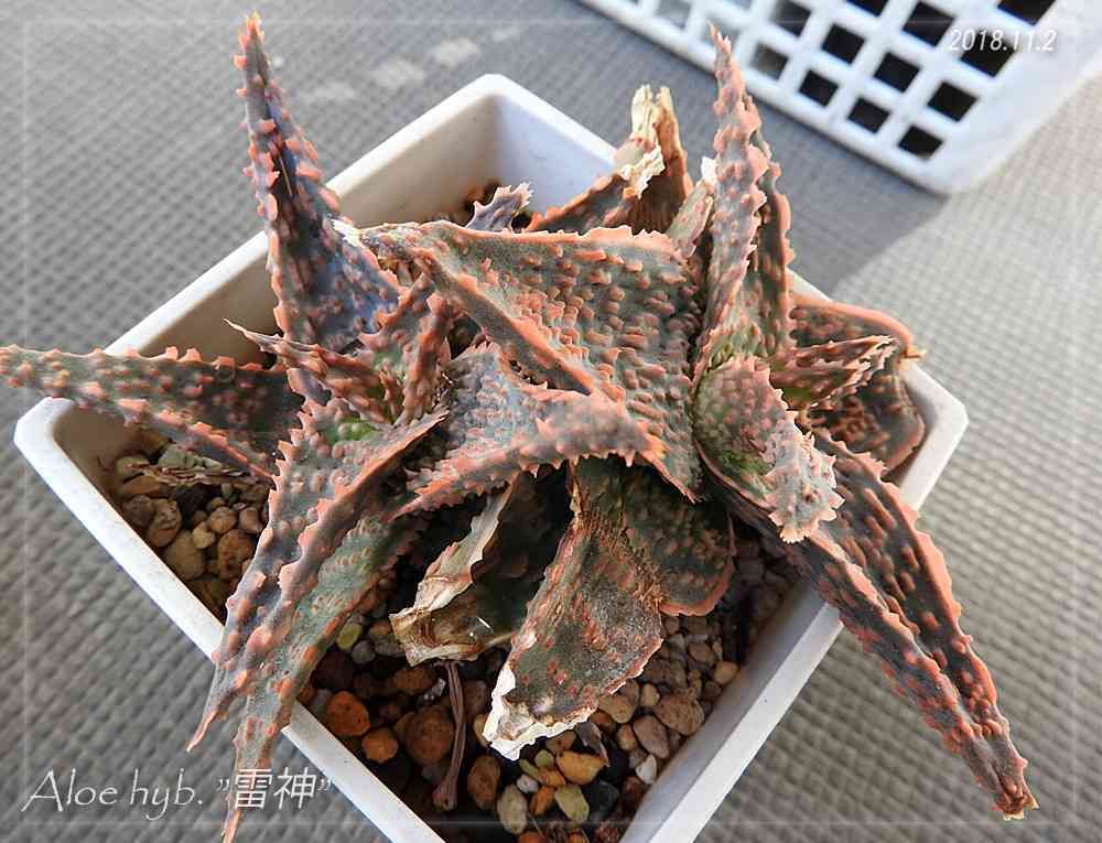 アロエ交配種、雷神。急に朝晩が寒くなったので、真っ赤になりました。前回の冬越しではかなり痛めてしまったので、今度はうまく冬越しさせないと。