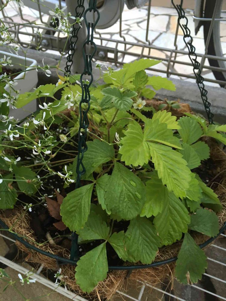 ユーフォルビアダイヤモンドフロストが写り込んでるので分かりにくいですが、ワイルドストロベリーのお花が咲いてます😊