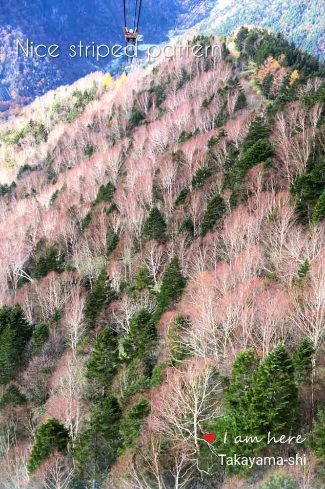 トドマツとダケカンバが綺麗な縞模様を作っている。緑のトドマツ、葉を落としたダケカンバの白い幹、僅かに残った葉の茶色、緑白茶の3色の縞模様に見えませんか…❓見えない人は想像力を働かせて…。ヨロシコ❗👍💚🧡💟🌲🍁
