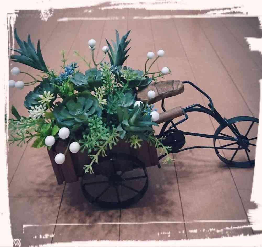 可愛い三輪車の雑貨に、バラの造花1本だけ挿してあって何とも味気ないアレンジだったので、バラを引っこ抜いて自分好みにアレンジしました🍀