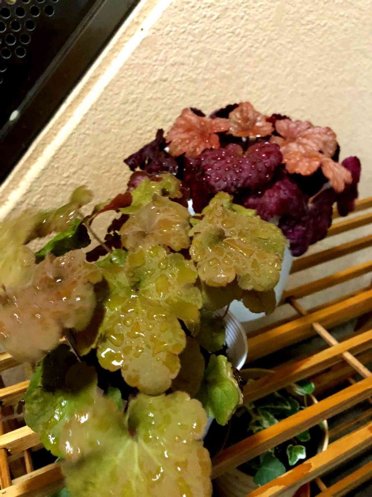 夜のヒューケラ。多肉達に水あげしたくなる衝動を満たしてくれるヒューケラちゃん。