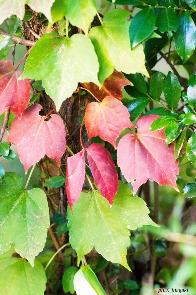 庭園の茂みの木にツタが絡まっていて、丁度赤い紅葉が始まっていました。やがては真っ赤になっていくのでしょうが、すこし緑が残っているのもまた良いかと思います。