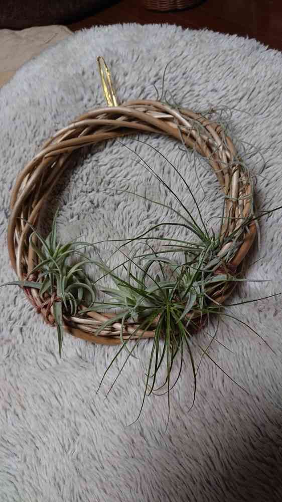ダイソーのリースに麻ヒモで固定してある、ダイソー出身者のチランジアたち