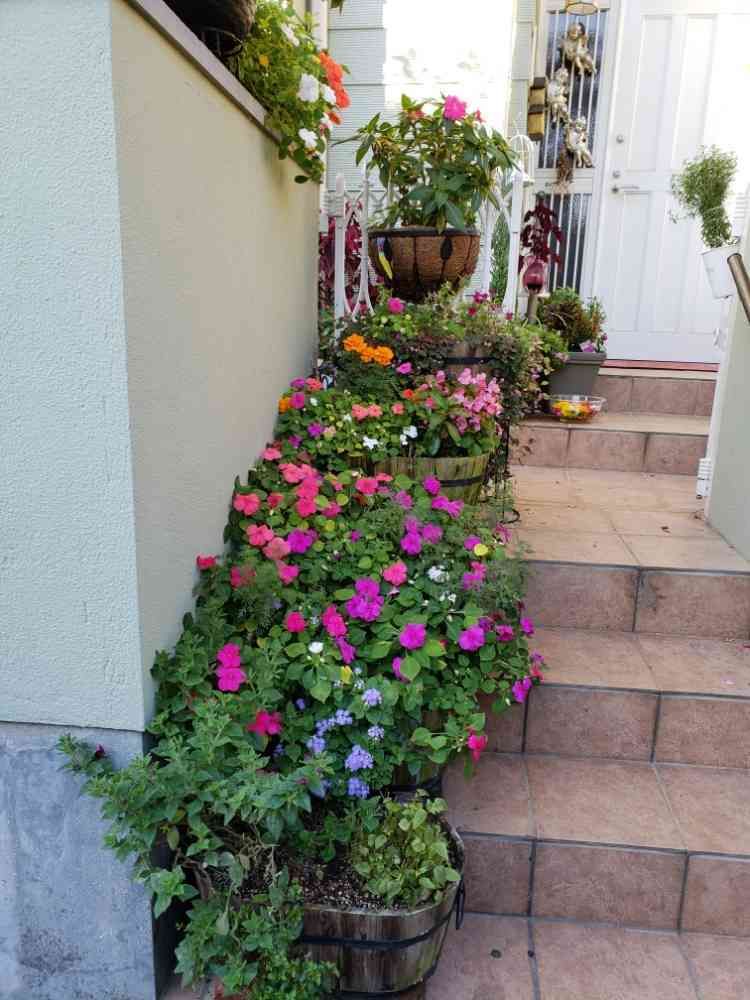 今朝8時7分の玄関のインパチェンス、アゲラータム、ペンタス、ベゴニア、ポリゴナム、マリーゴールド