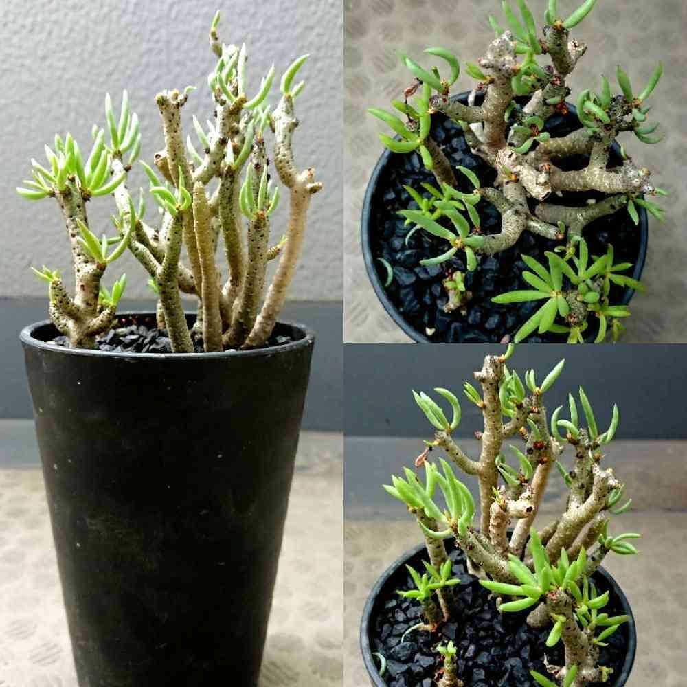幹となる部分は灰色〜黒色で枝先には赤い成長点が点在し、ここから多肉質な細長い葉を数枚茂らせます。最大でも高さ20〜30cm程度にしかならず、成長が遅いため国内で大きな個体はあまり見かけません。また枝がもろく小さな衝撃で折れてしまうため、取り扱いに注意が必要です。折れてしまった場合、挿し木で増えるため土に植えて増やしましょう。花は休眠に入る手前、季節でいうと春にピンクの綺麗な花を咲かせます。