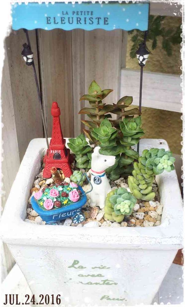前にある多肉ちゃんがこんにちわしてるのをワンちゃんが見てるようにも見えますね♪