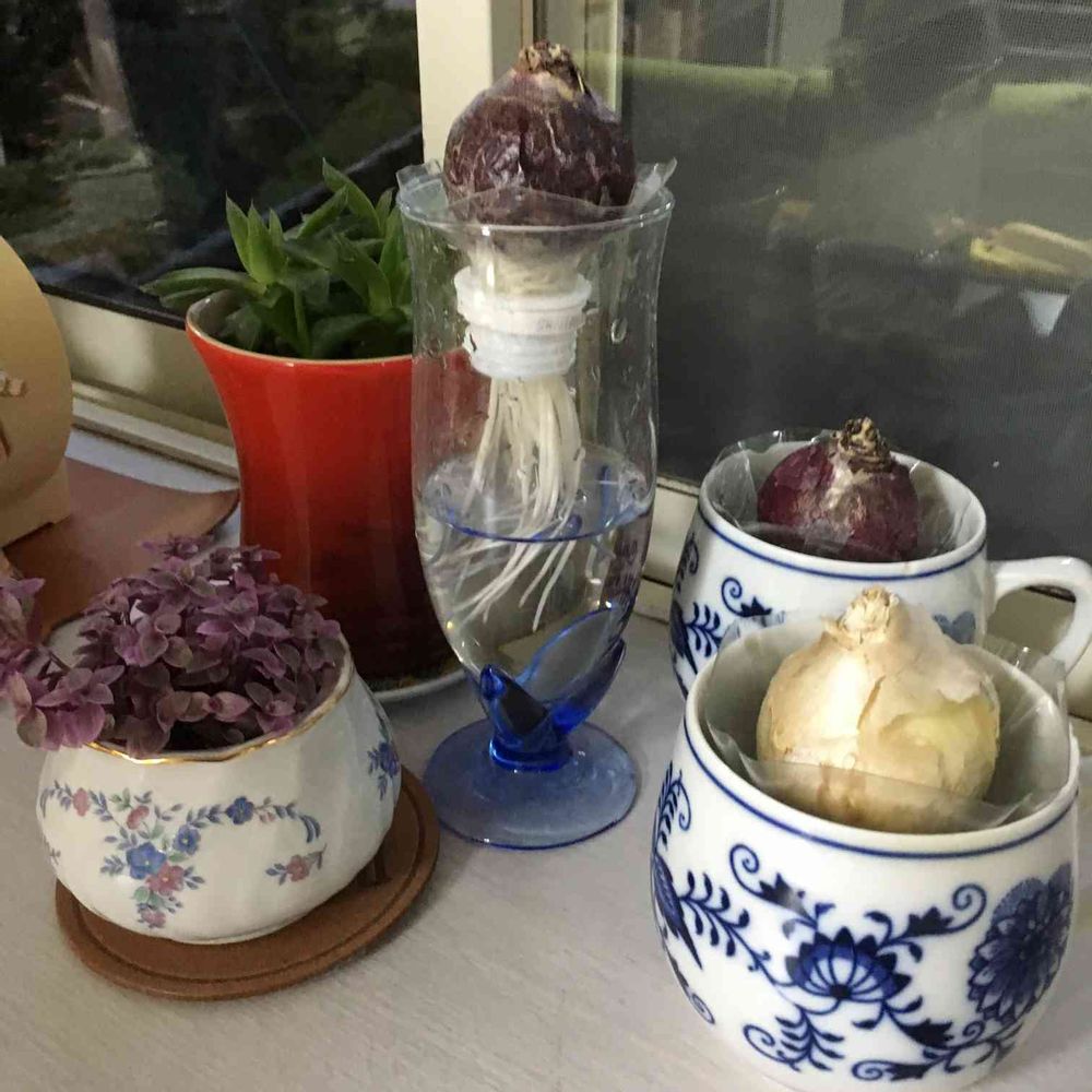 ヒヤシンスの水栽培🤗発根したので、欠けちゃったお気に入りのお茶碗やグラスに入れました♪