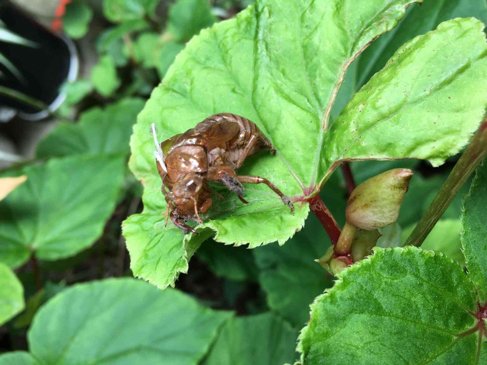 虫の写真は苦手なので載せたくなかったんですが、珍しくウチの庭の秋海棠の葉の上に、しがみ付いているセミの抜け殻があまりにけなげだったので…
