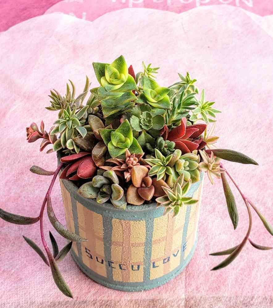 チモモさんからいただいた作家さんのリメ缶に、黄色と緑色が綺麗なお星さまを中心に、寄せ植えをしてみました。😃✨