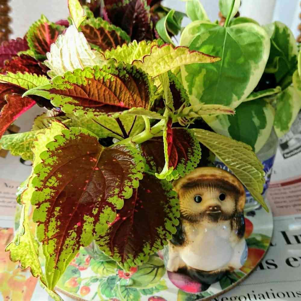朝日を浴びるコリウスたちとオタヌキさま(*^_^*)