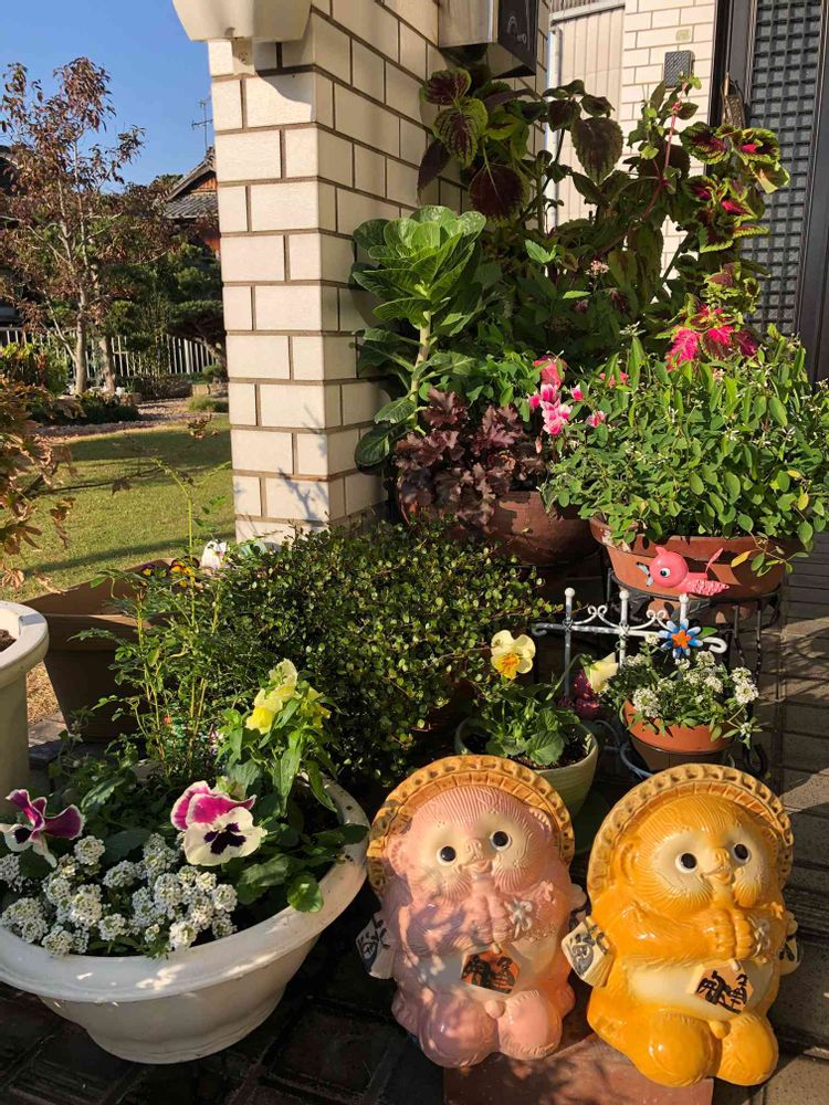 たぬきの横は最近、パンジーの寄せ植えしました❣️