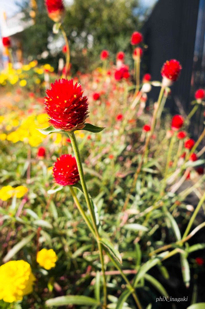 線路沿いの小さな花壇に真っ赤な玉がコロコロ咲いていました。お昼なんですが,ちょっと傾いたお日様を受けて光っていました。