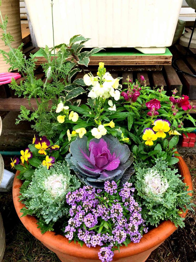 日々の努力と邁進ですよねー。寄せ植え、葉牡丹とムラサキのアリッサムいい色ですね。金魚草、うちのはプランターのが、萎れてしまい…何故なのか?水のやり過ぎ?根を痛めた?原因分からず…ちーさんは、元気で良かったです👍