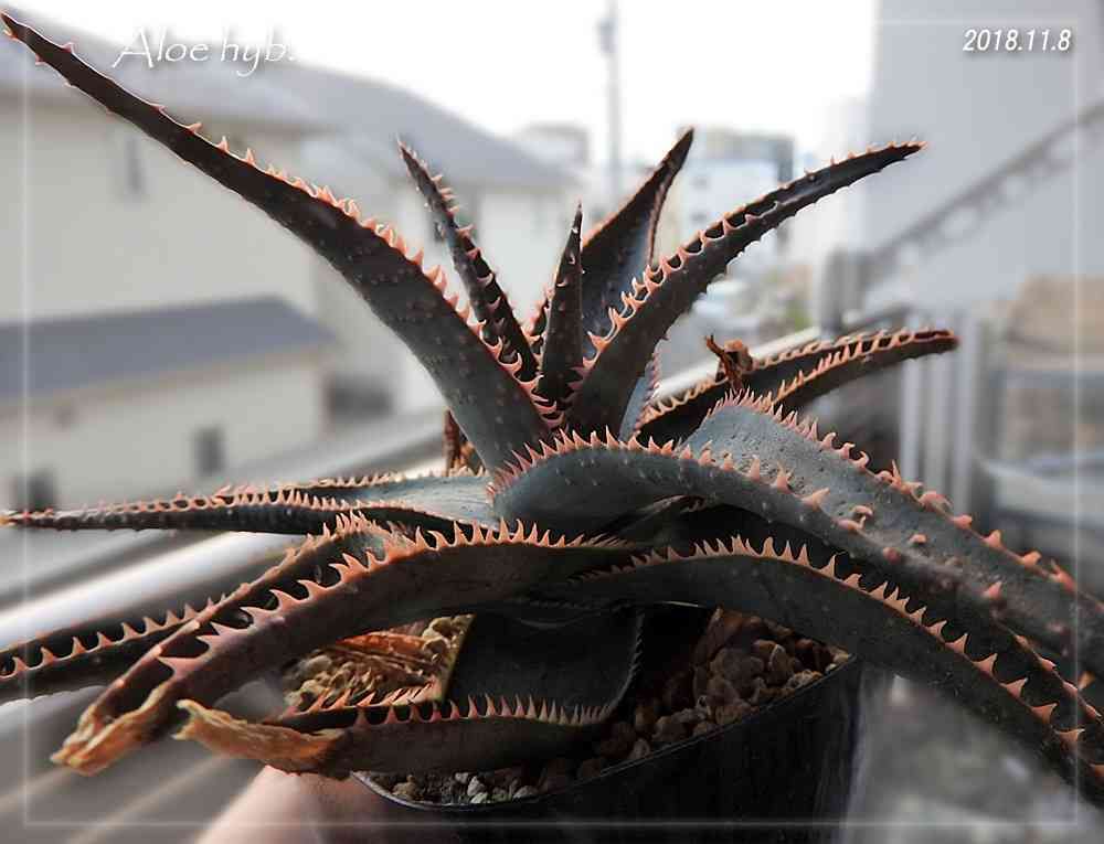 アロエ交配種。繊細なピンクの鋸歯が西日でいっそう色づいてきれい。来春、植え替えたらもっと大きくなるかな?