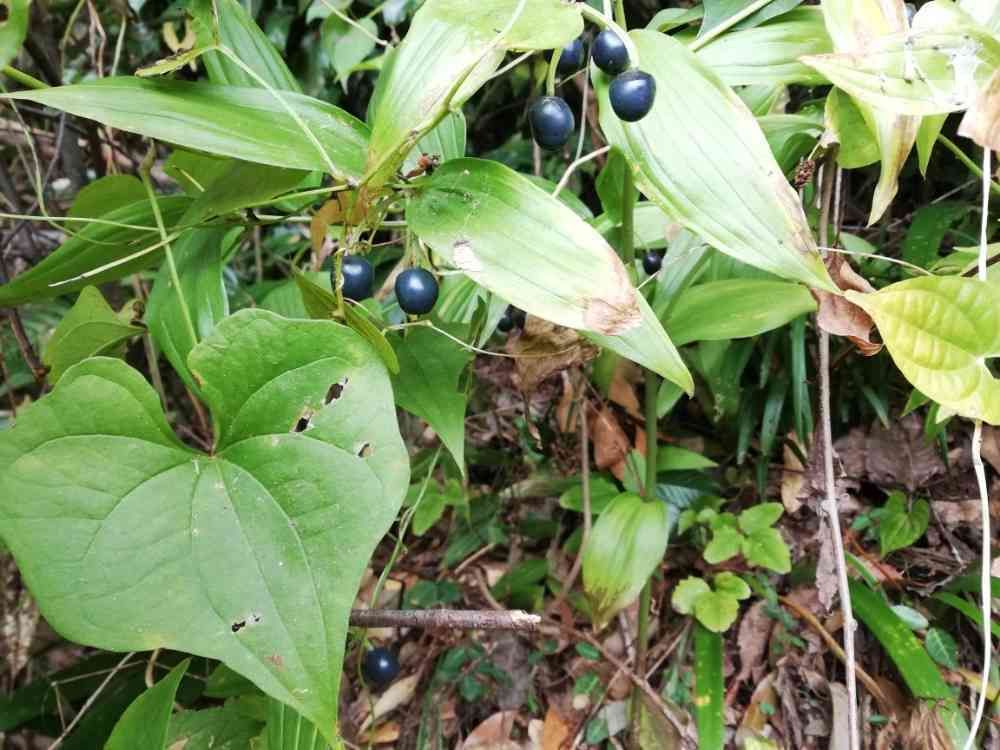 ヤブミョウガでしょうか?。高尾山、陽当たりの良い1号路、湿り気の多い日陰の感じの6号路共に登って、降りてくるまで全部に生えていました。黒い実や、まだ熟さない青い実、ちょっと白っぽくなったグレーの実もありました。枯れてきていた葉っぱ🌿もありました。 山の紅葉🍁は、まだ少ししているくらいでした。