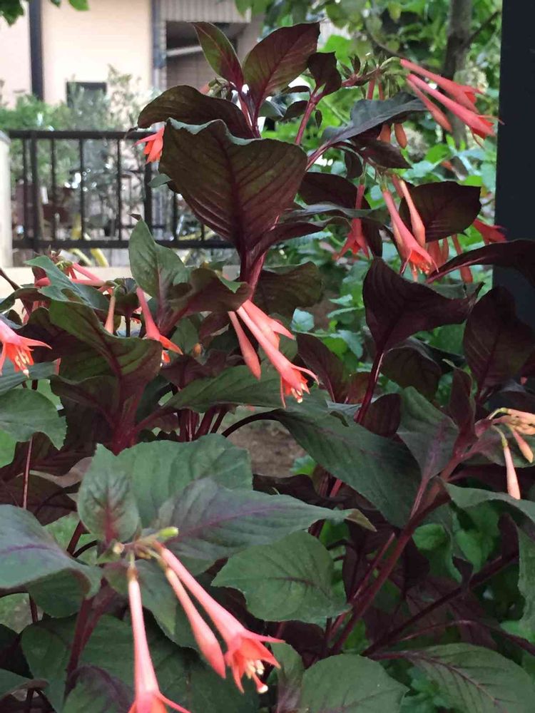 私もフクシアというと、ピンク系で少しプックリしたお花のイメージでした💕 このこはスリムで葉の色も楽しめます🌿😊