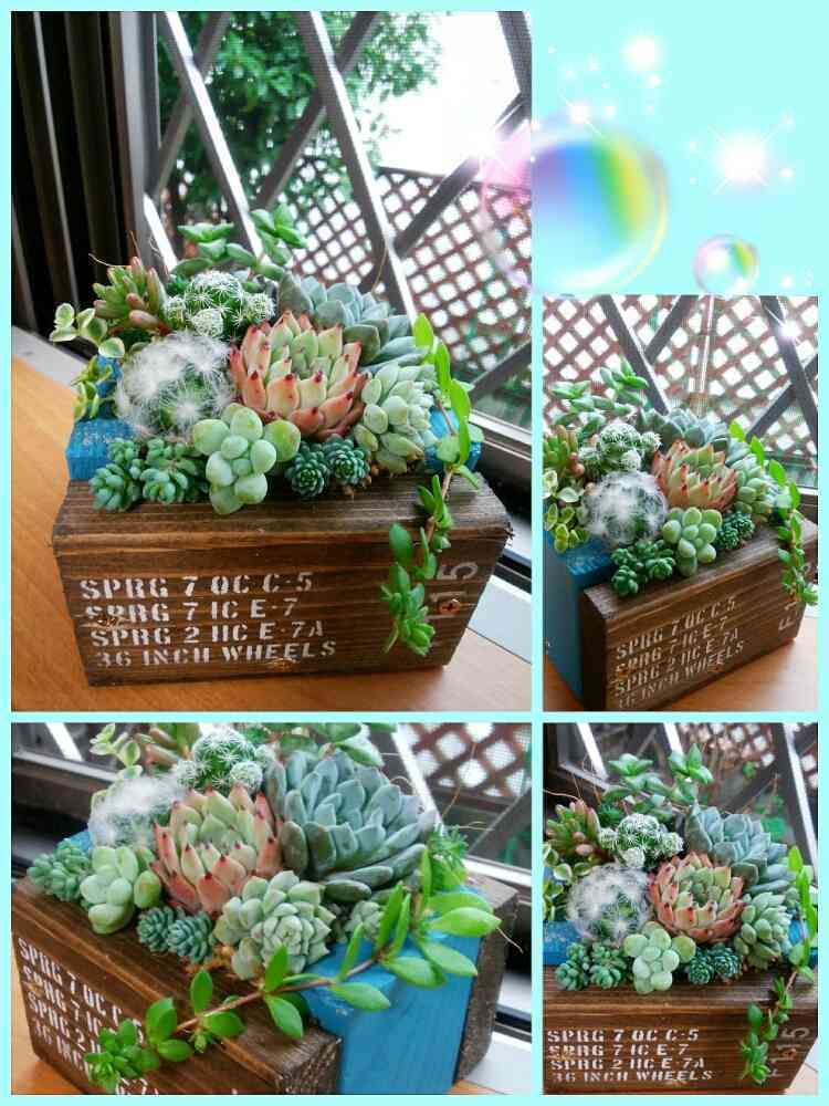 ウッドプランターの色が大好きな色合いで、合う色の多肉を考えました💙❤💚