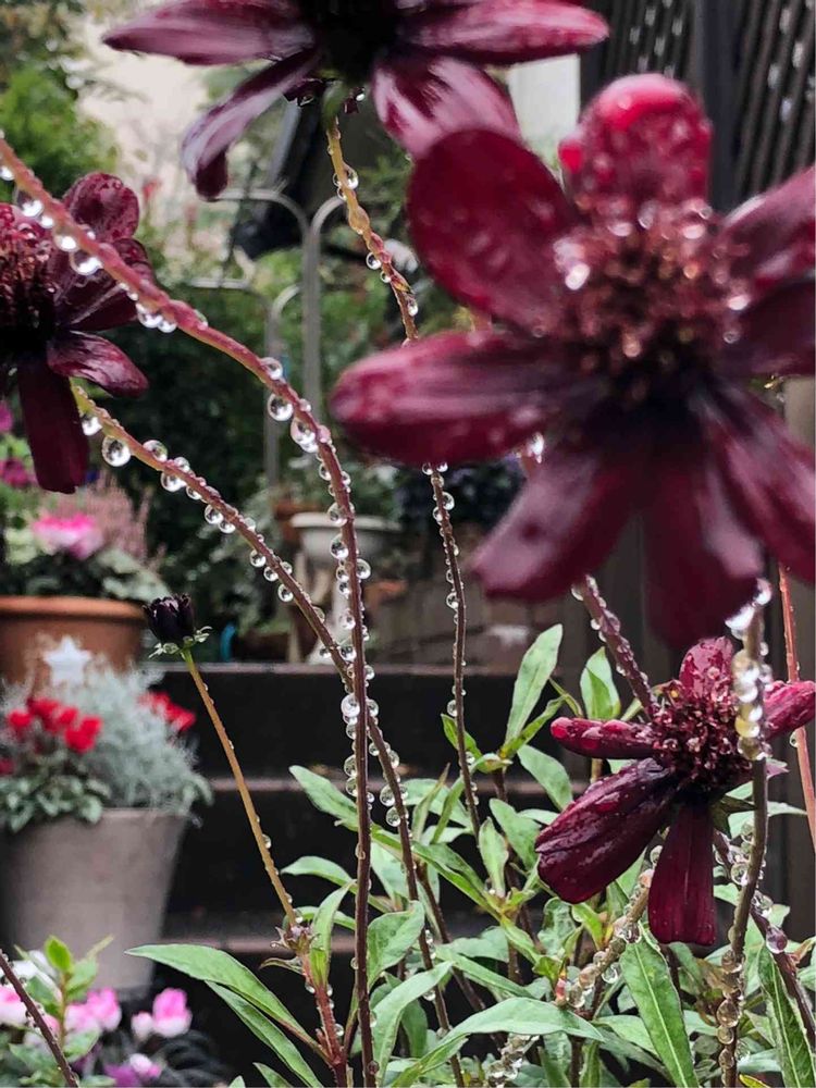 朝、雨がやんでました。チョコレートコスモスに水滴が💧付いて綺麗でした😊