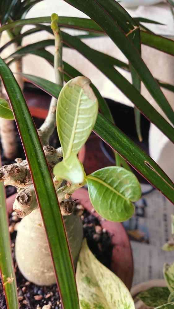 アデニウムの葉っぱ🍃が最近、写真みたいに先っぽの方から枯れていって落葉するんです😭それでそんなふうにしてどんどん落葉していって今はあんまり葉っぱありません💦どうしたら良いですか⁉️