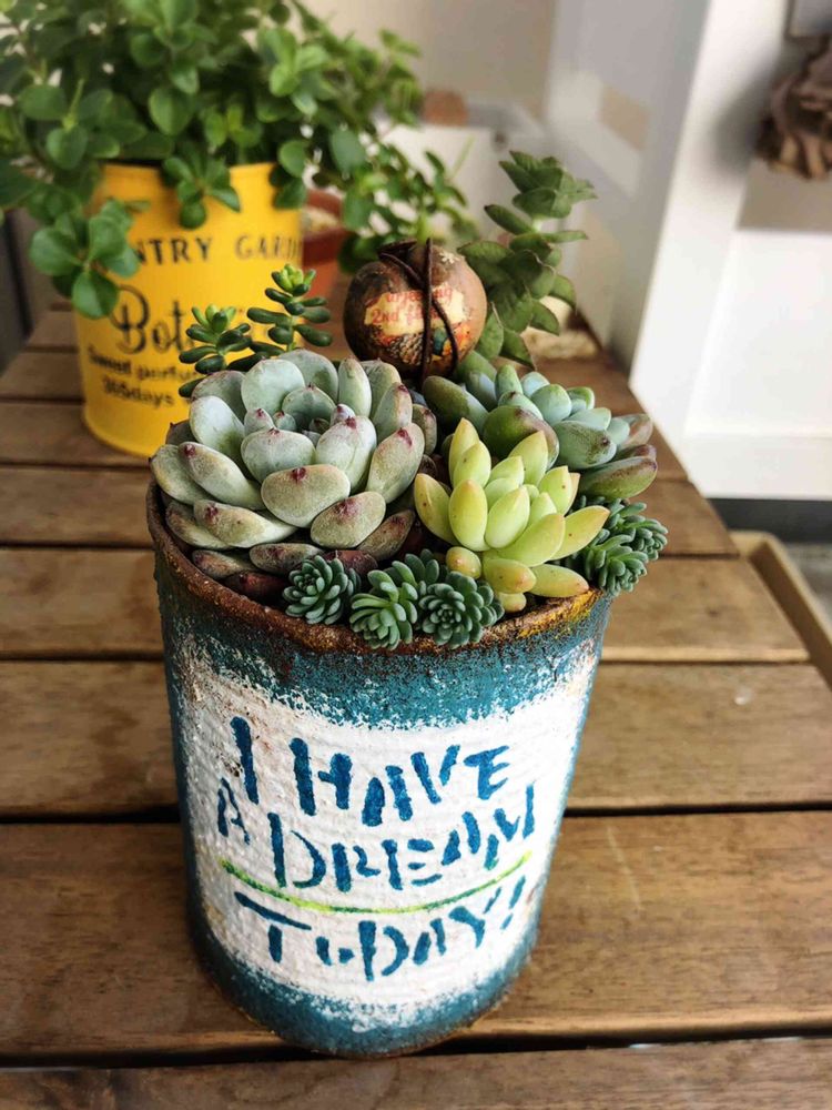 今回は持ち合わせの多肉でやったので、何を入れるか悩みました。リメ缶が素敵なのでサマになってますかね😆✨