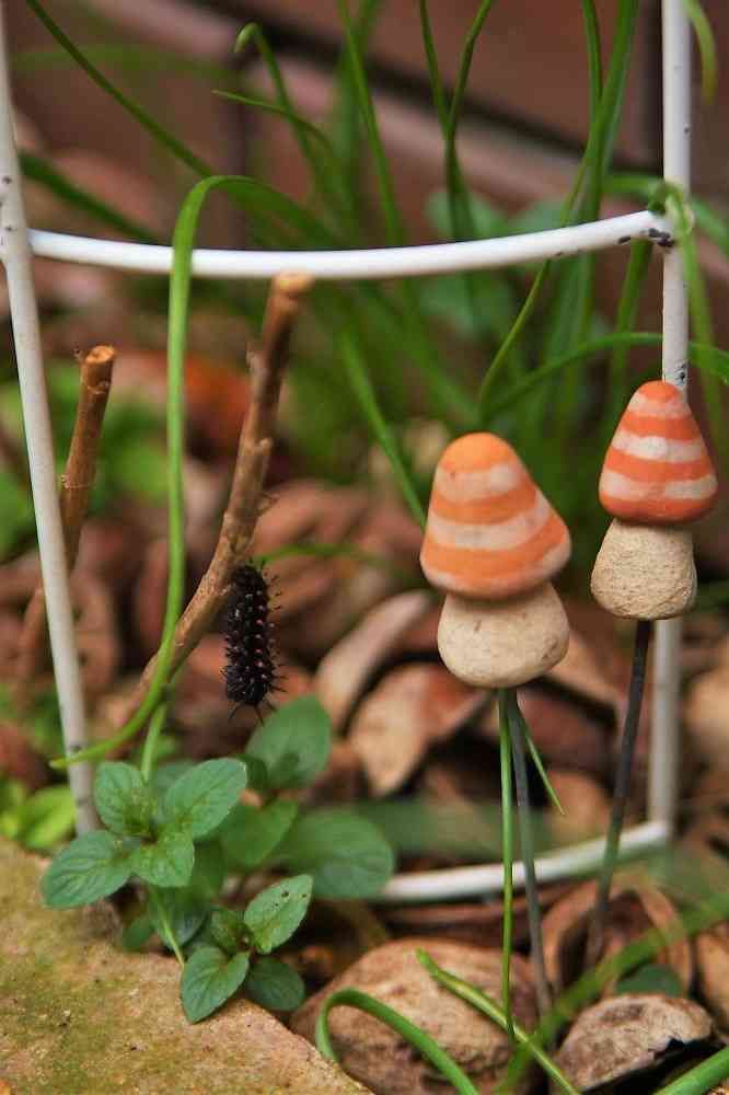 ブラックミントの上、ベロニカの剪定下枝にぶら下がるのは、ツマグロヒョウモンのう幼虫デス💜 サナギの準備に入りましたヨ