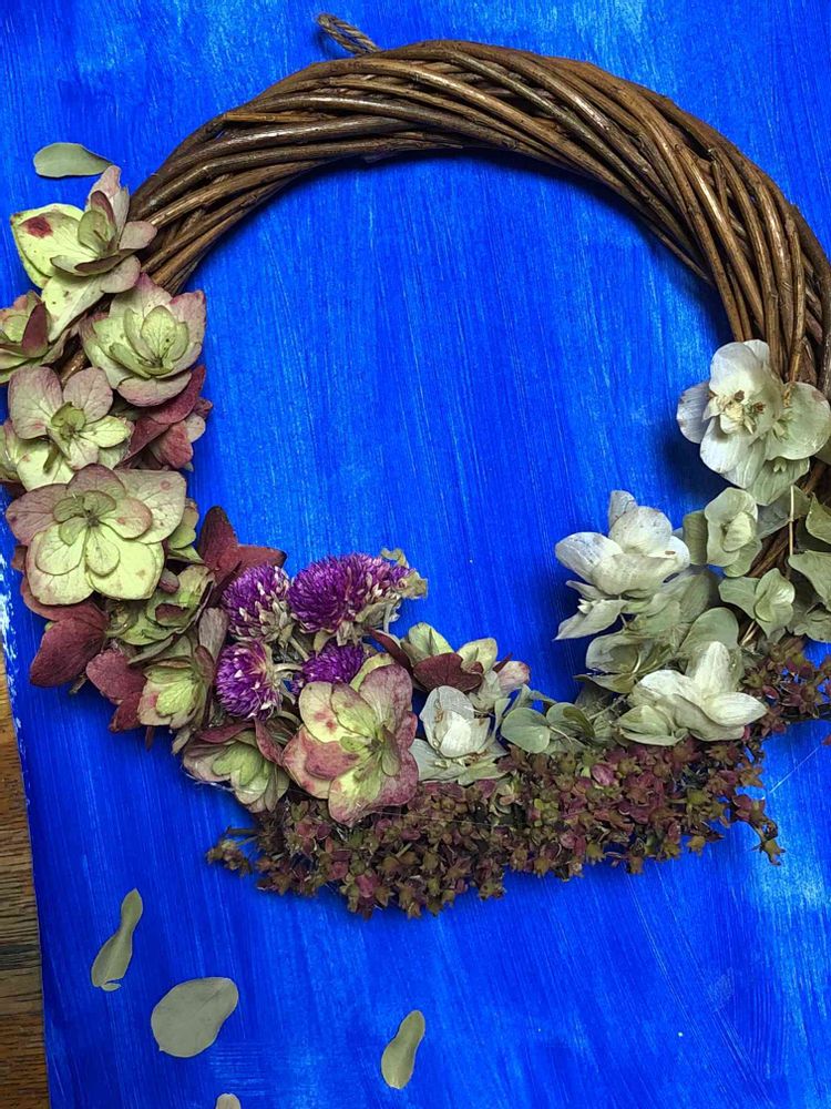 ドライにしておいた、センニチコウやアジサイなどを使って100均のリースにグルーガンでつけてみた。