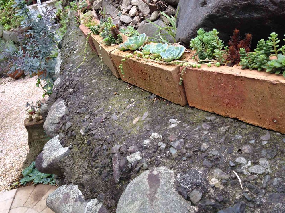 勝手口のベンチに座ると目の前にブロックの穴に多肉ちゃん達💕