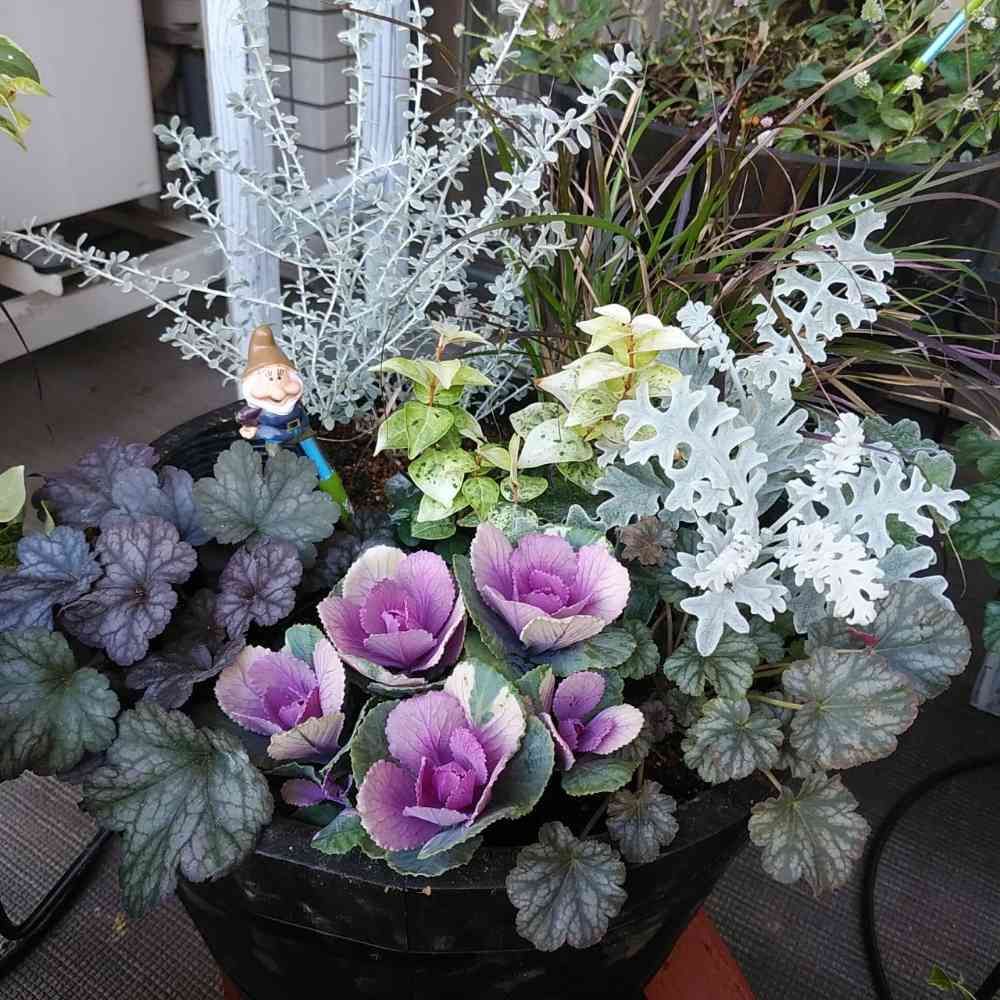 スプレー咲きのハボタンと合わせた、リーフ類が素敵な寄せ植えですね~✨