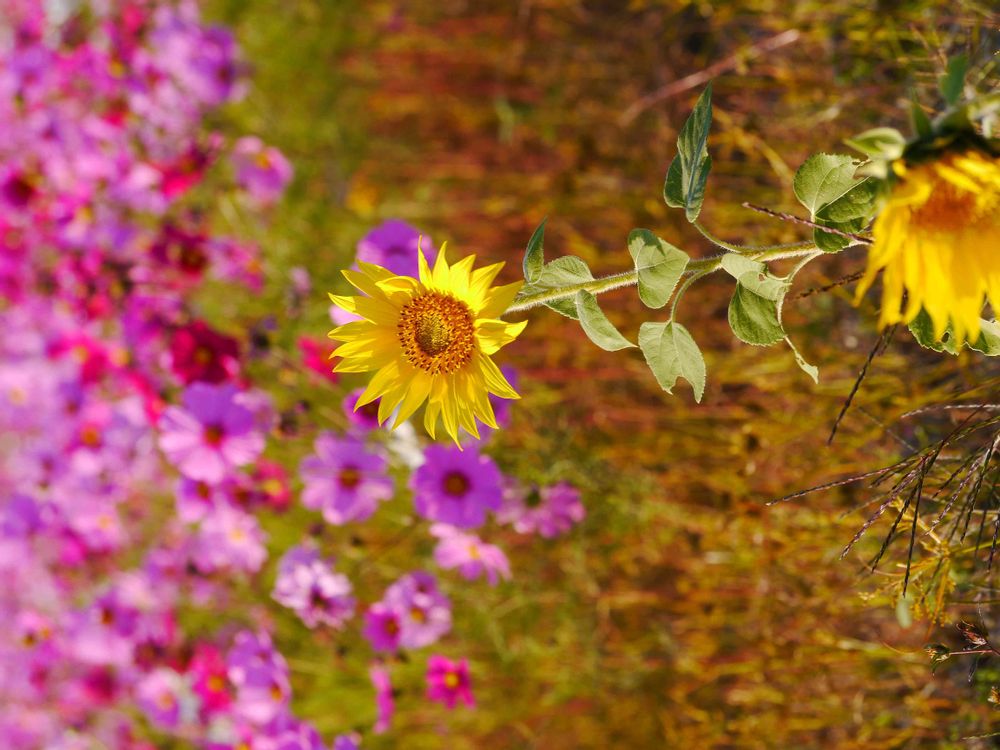 コスモスもそろそろ終わりが近づいている中、ヒマワリがぽつんと咲いている。