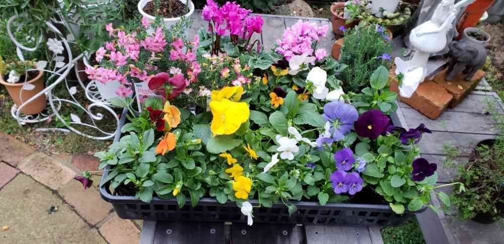 今日は、「初恋草」を三色(青、ピンク、濃いピンク)3ポット、ガーデンシクラメン「ポンポン」2ポット(よい香りがあり花に縮みがある、ピンクと濃いピンク)を購入、合計約2050円