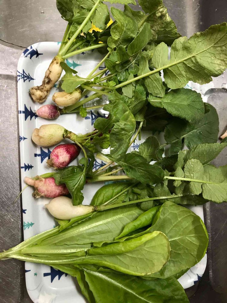 ベランダの各所が窮屈になってきたので、二十日大根とサラダ菜を収穫。